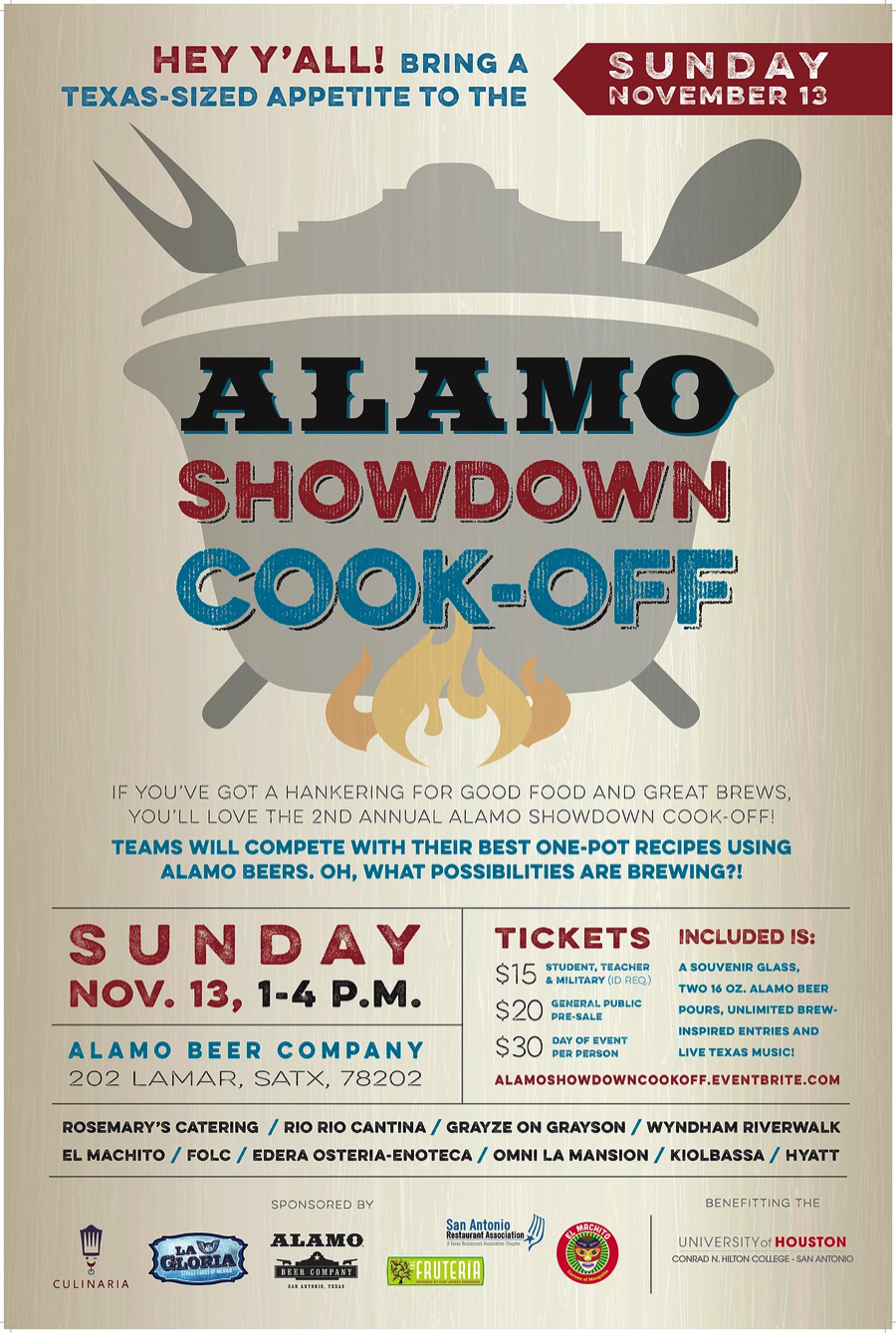 If you’ve got a hankering for good food and great brews, you’ll love the 3rd Annual ALAMO Showdown Cook-Off! Teams will compete with their best one-pot recipes using ALAMO Beers. Oh, what possibilities are brewing...?! Tickets include tastes of each of the brew-inspired entries, a souvenir glass, one 16 oz. ALAMO Beer pour and Live Texas Music at the Beer Hall! The event will benefit the University of Houston Conrad N. Hilton College San Antonio.