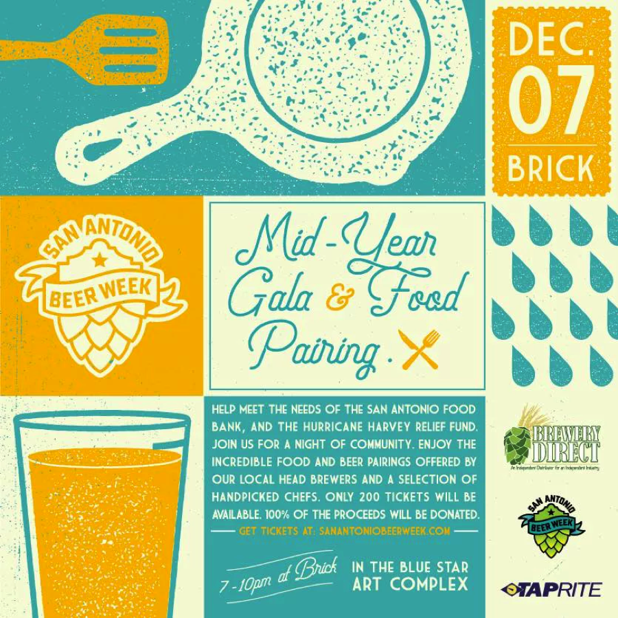 Join the San Antonio Beer Week community for a Mid-Year Gala & Food Pairing at Brick in the Blue Star Arts Complex on Thursday, December 7th, from 7-10pm.